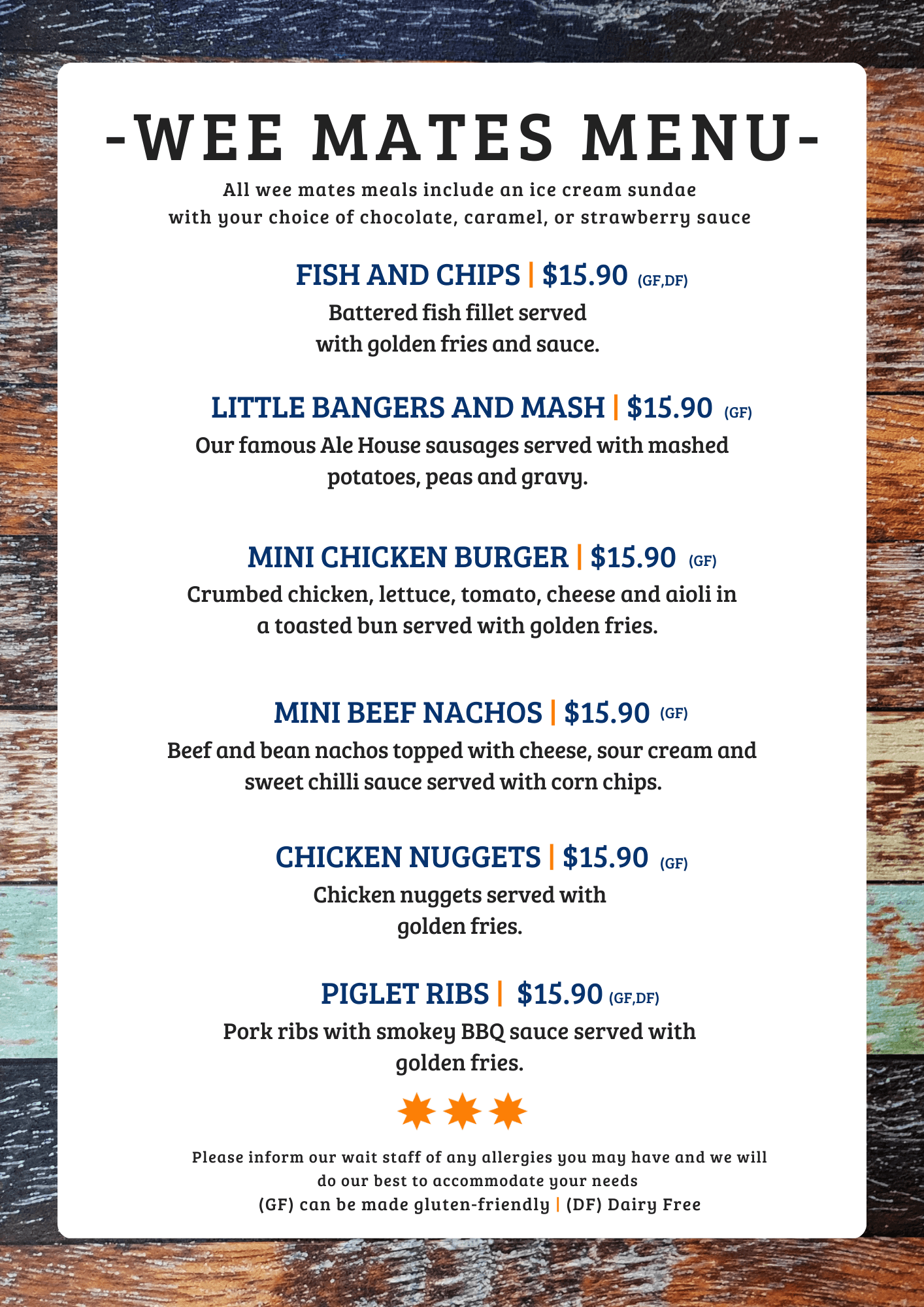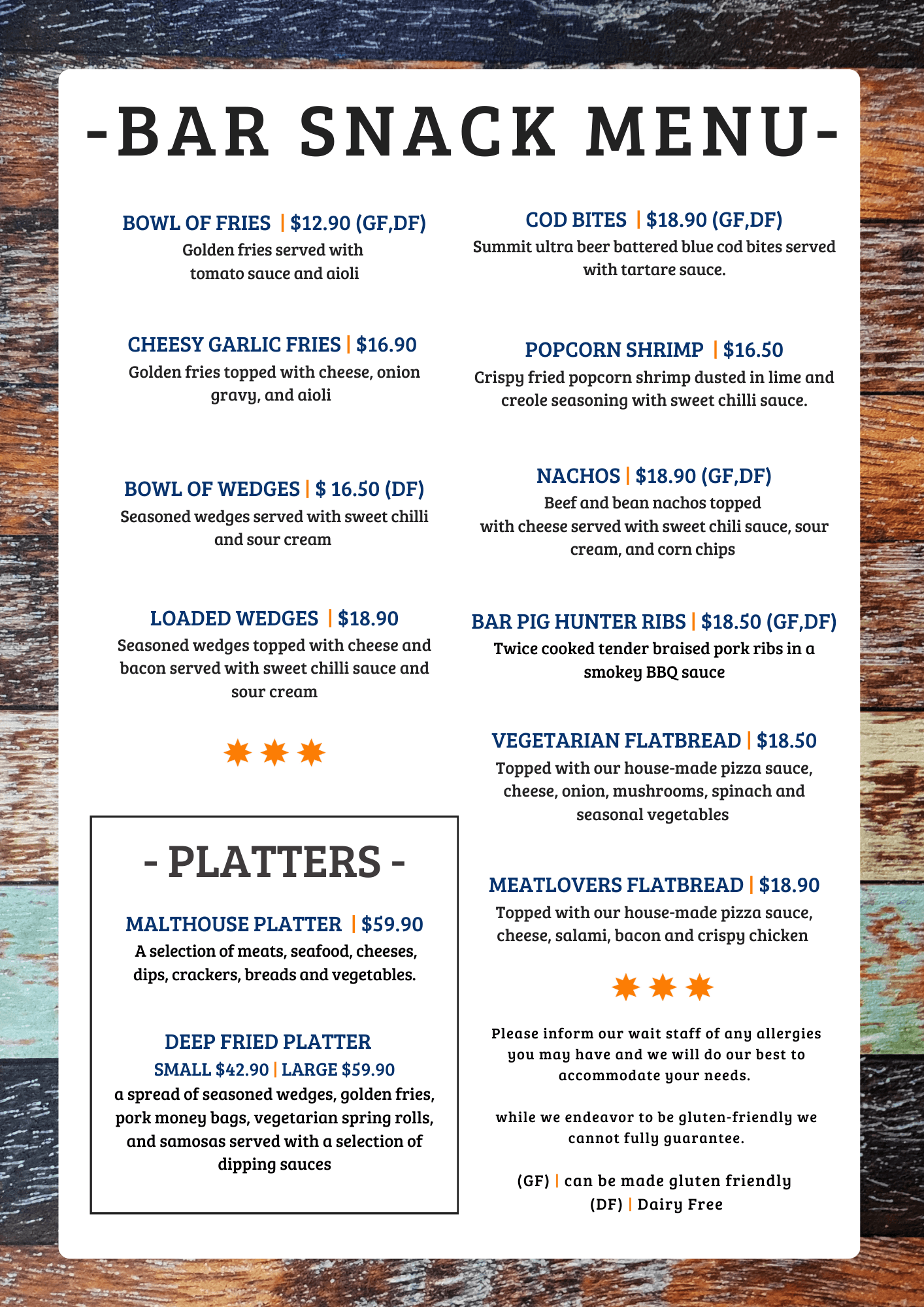 BAR SNACK MENU AND KIDS MENU
